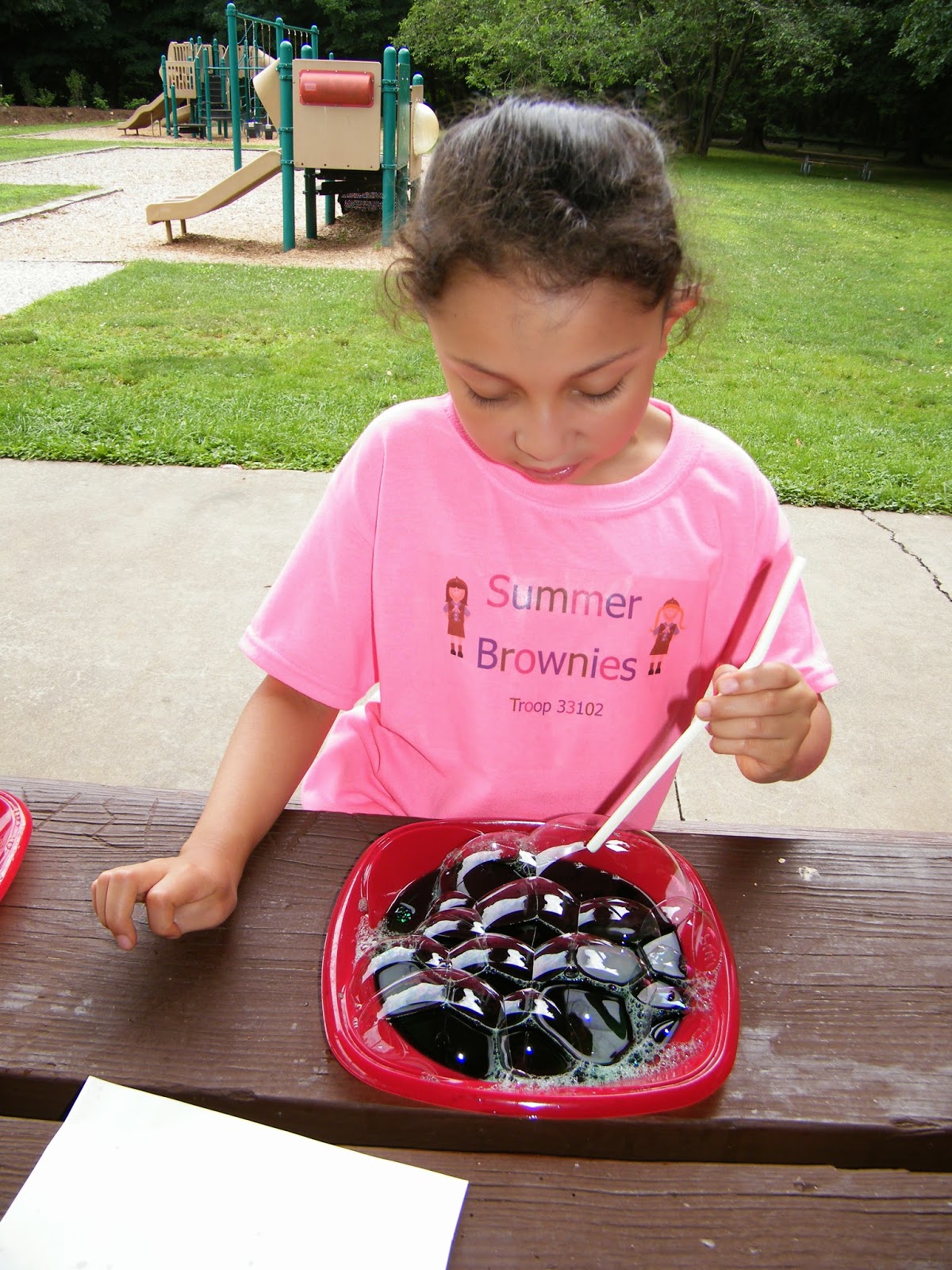 Today we had our last Summer Brownie session. It has been a fun journey learning all about water and how we can conserve and protect it. Today we had a great time with bubbles. We started our session with ice art. The kids used colored ice to create their pictures. Then we made bubble art. This was really fun! The kids used a mix of water, dish soap and food coloring. They blew straws in the liquid to make bubbles and then they laid their papers on the bubbles. Very cool project! The girls had a bucket and sponge water race again. They also make beautiful bubble wands with glass beads and tried their wands out by making homemade bubble solution. After lunch the girls had fun painting flower pots and filling them with soil and sweet pea seeds. The troop shared their water promises with one another and earned their well deserved badges for the WOW Wonders of Water journey.